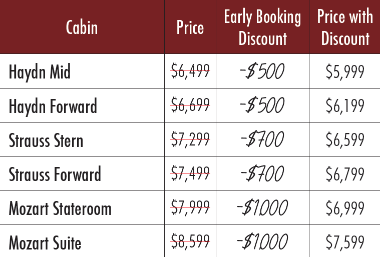 Single supplement +$3,000 for Haydn, +$4,000 for Strauss and Mozart, + $5,000 for Suites.